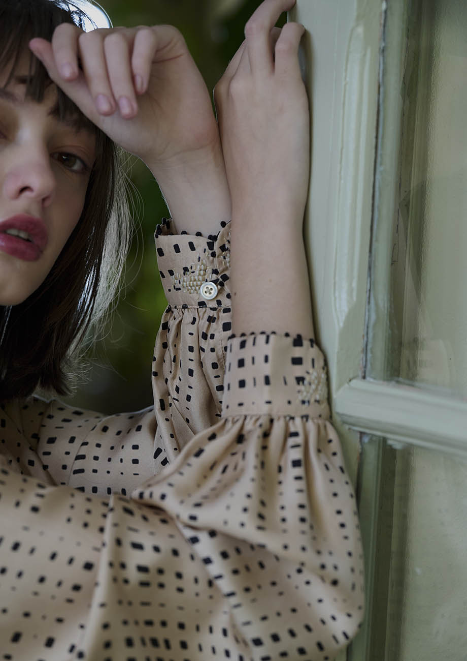 So ist der kleine Schlitz am Halsloch entweder hinten oder vorne. Die Hand bestickten Labels wurden hier extra seitlich Richtung Schulternaht eingenäht, so können Sie die Bluse ganz nach Belieben tragen.