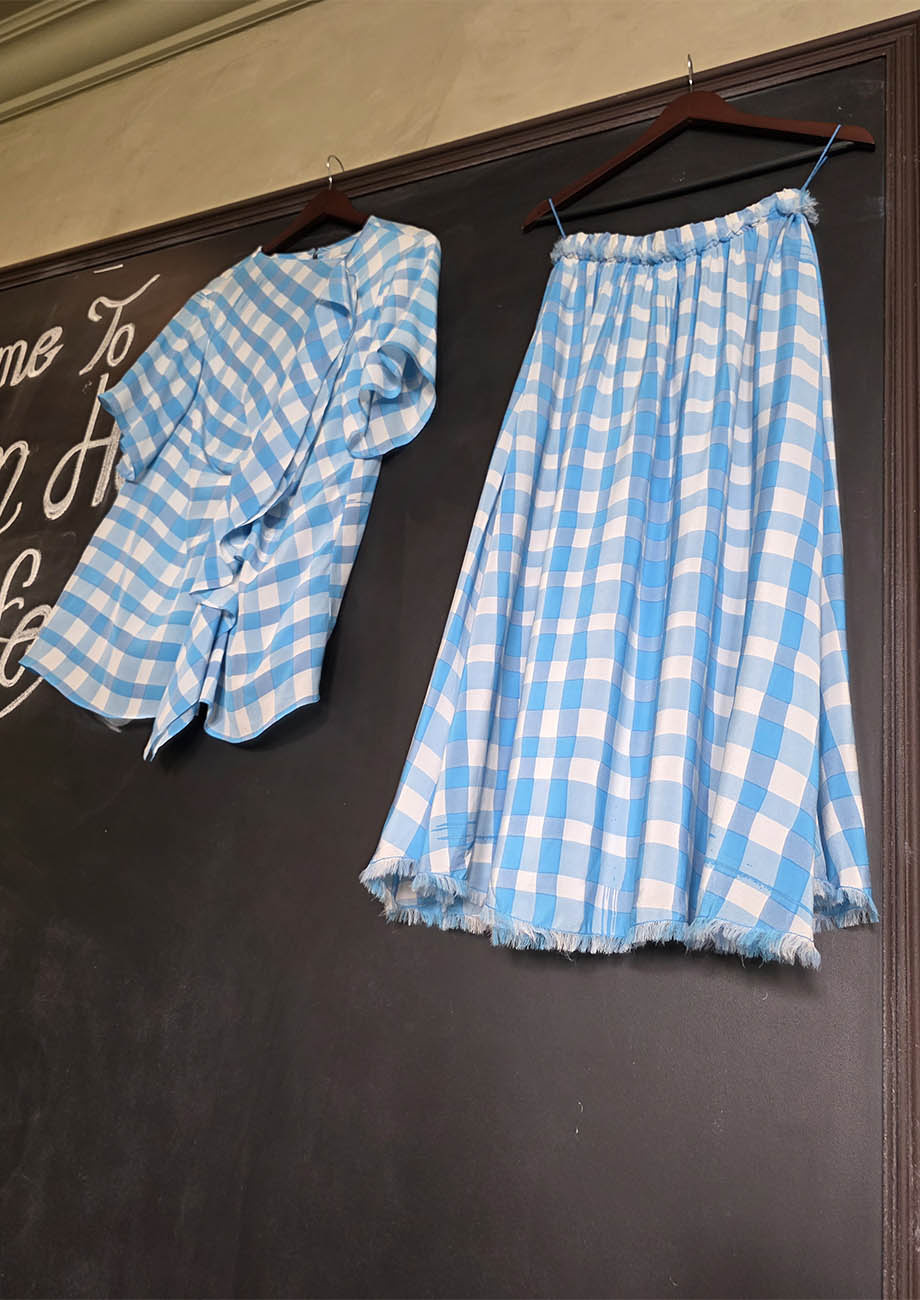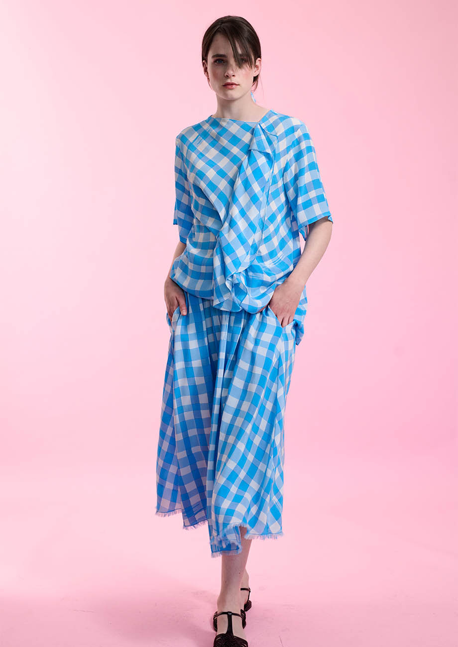 FRINGE SILK SKIRT - CHECK TURQUOISE