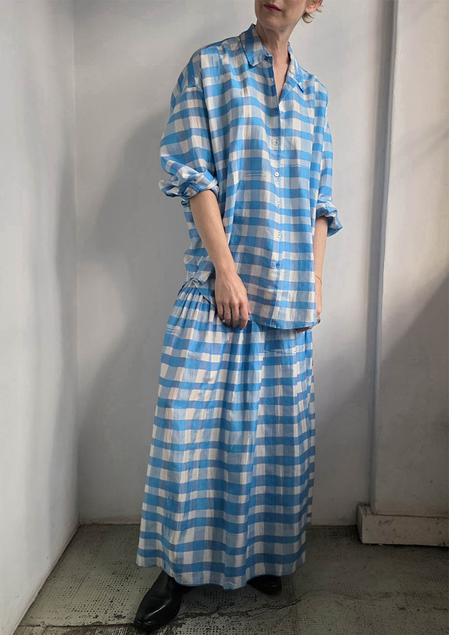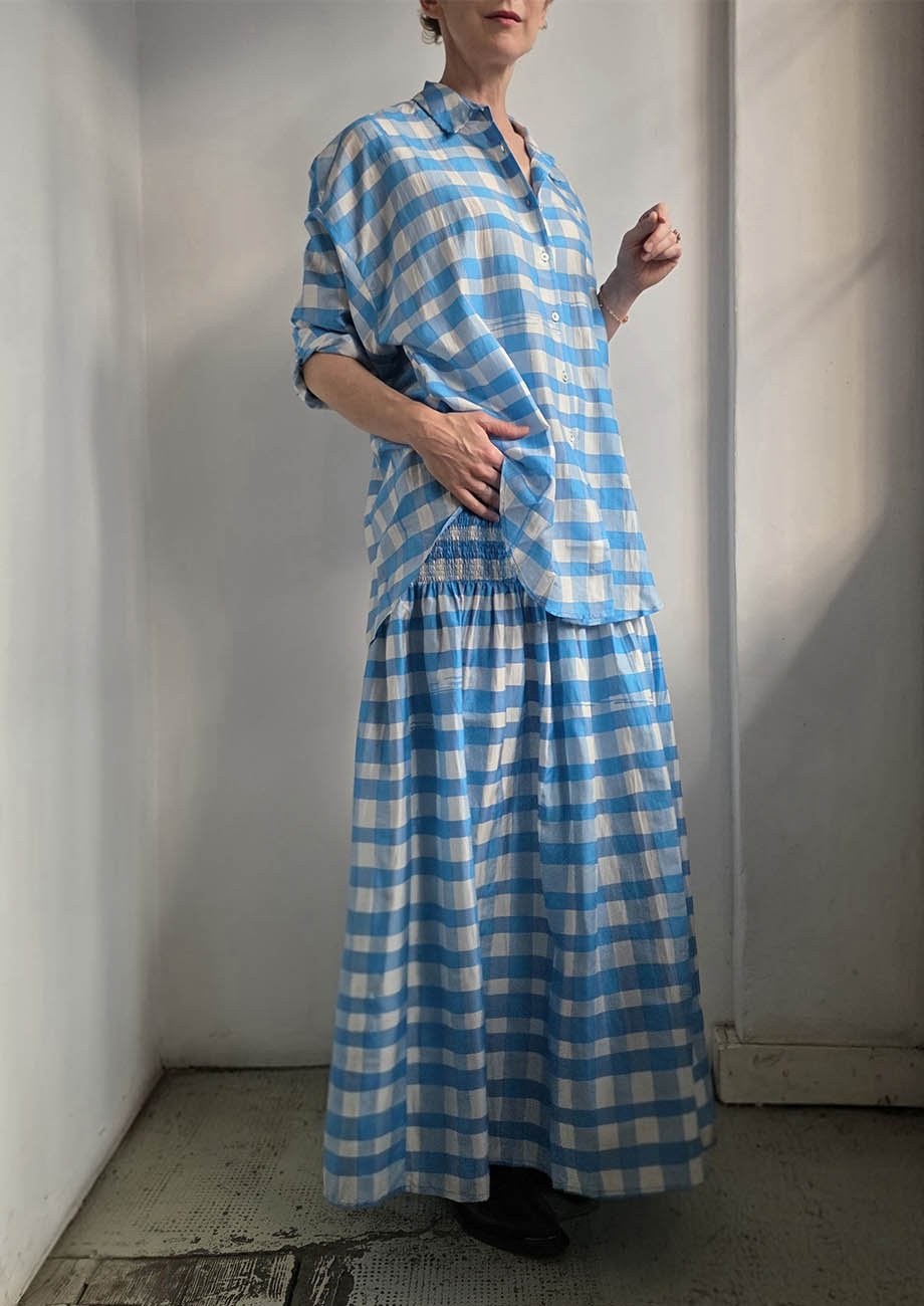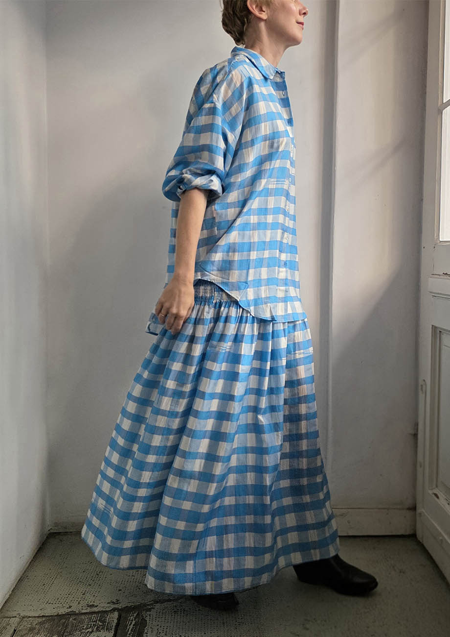 LONG SMOCK SILK SKIRT - CHECK TURQUOISE