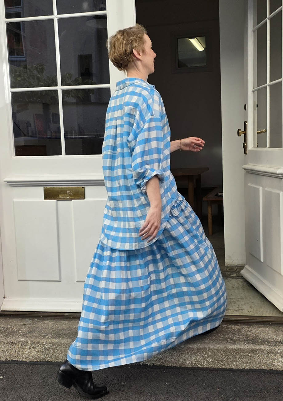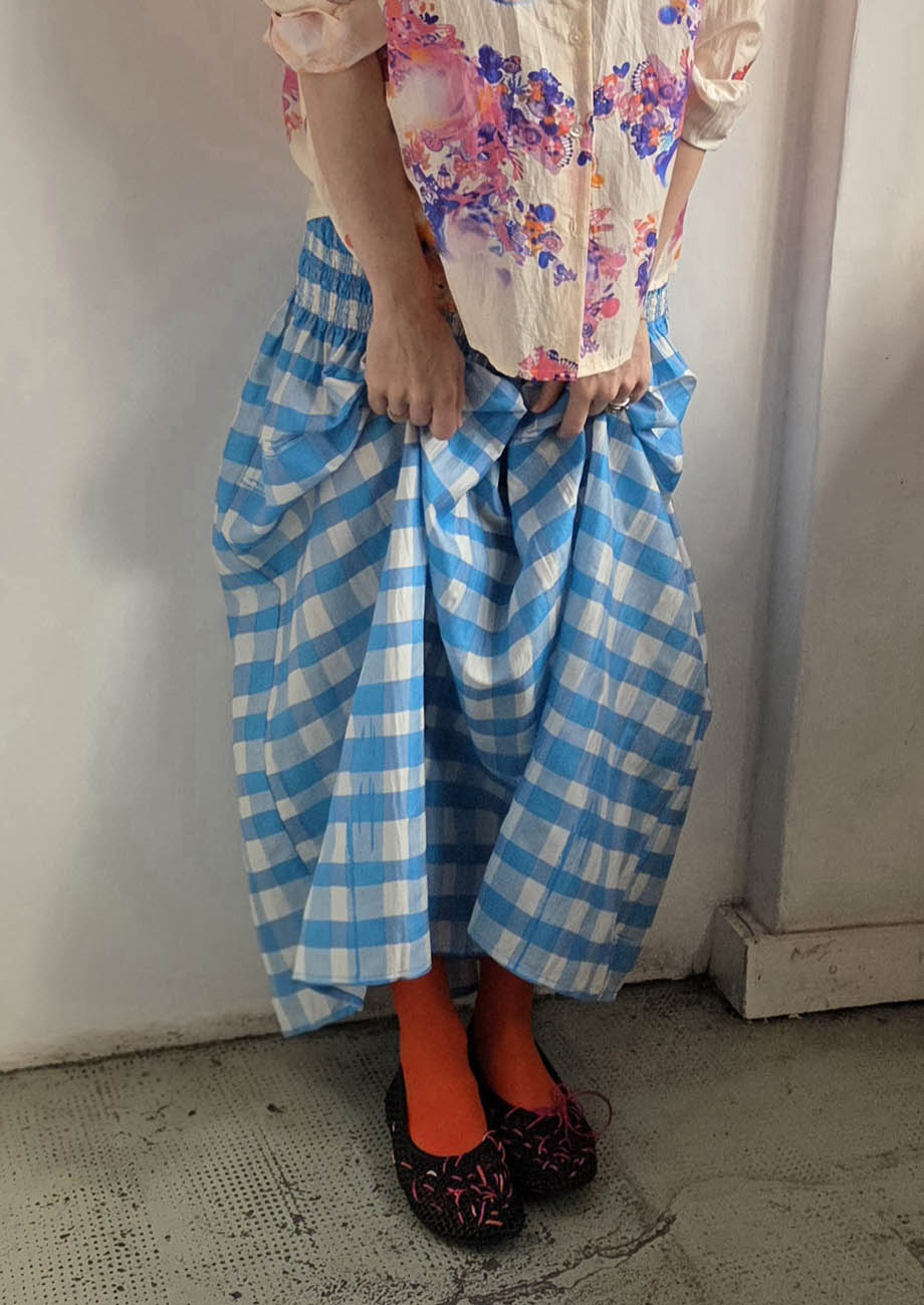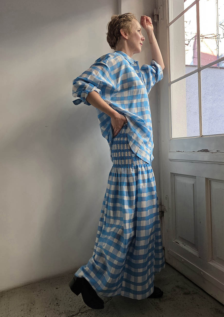 LONG SMOCK SILK SKIRT - CHECK TURQUOISE