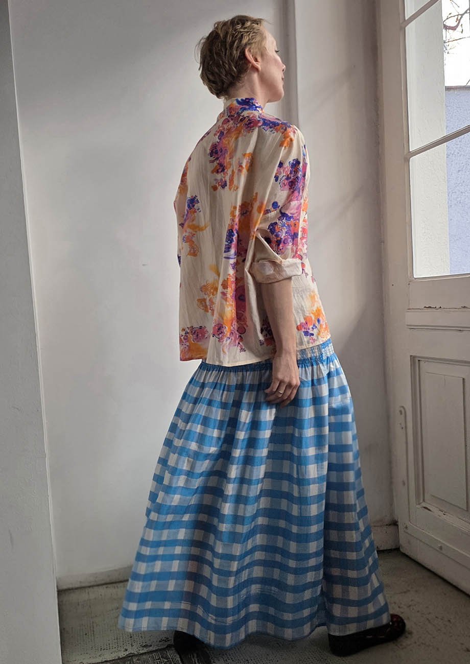 Hand-printed silk with hand-embroidered details.